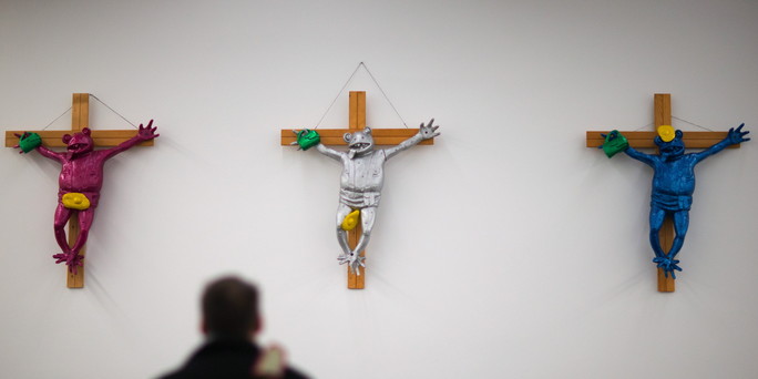 Ein Mann betrachtet am 21.02.2013 im Museum Hamburger Bahnhof in Berlin die Exponate “Füße zuerst” von 1991 in der neuen Ausstellung mit Werken von Martin Kippenberger. Der Hamburger Bahnhof zeigt ab dem 23.02.2013 unter dem Titel “sehr gut / very good” viele seiner Werke. Foto: Hannibal/dpa +++(c) dpa – Bildfunk+++